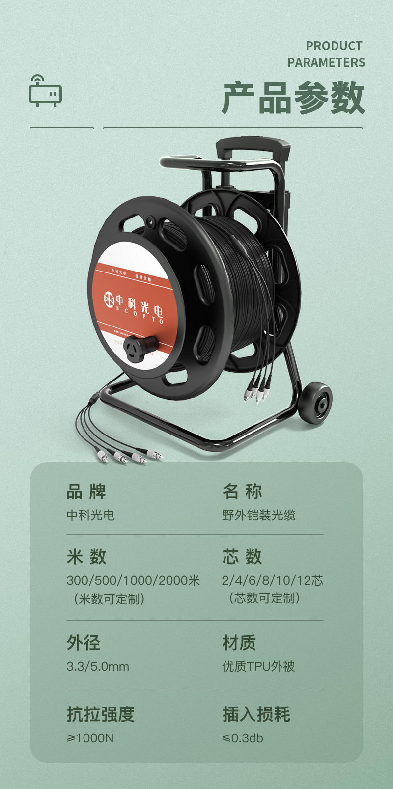 中科光電 單模四芯室外TPU野戰(zhàn)光纜 鎧裝防水基站通信野外拉練搶修  500米+放纜車+FC接口