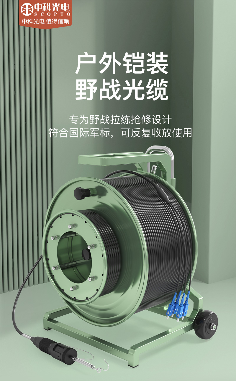 中科光電 單模四芯車壁式TPU室外野戰(zhàn)光纜鎧裝防水通信野外拉練搶修1000/2000米+放纜車+航空頭-SC頭