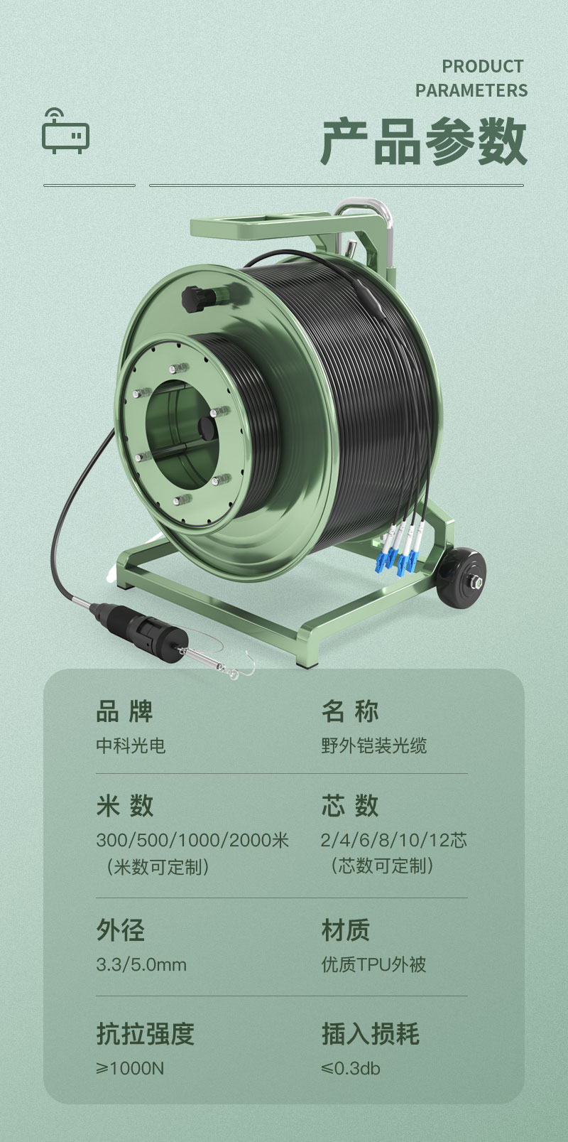 中科光電 單模四芯車壁式TPU室外野戰(zhàn)光纜鎧裝防水通信野外拉練搶修1000/2000米+放纜車+航空頭-LC頭