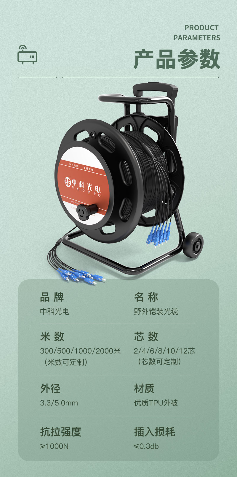中科光電 單模八芯室外TPU野戰(zhàn)光纜 鎧裝防水基站通信野外拉練搶修 500米+放纜車+SC接口