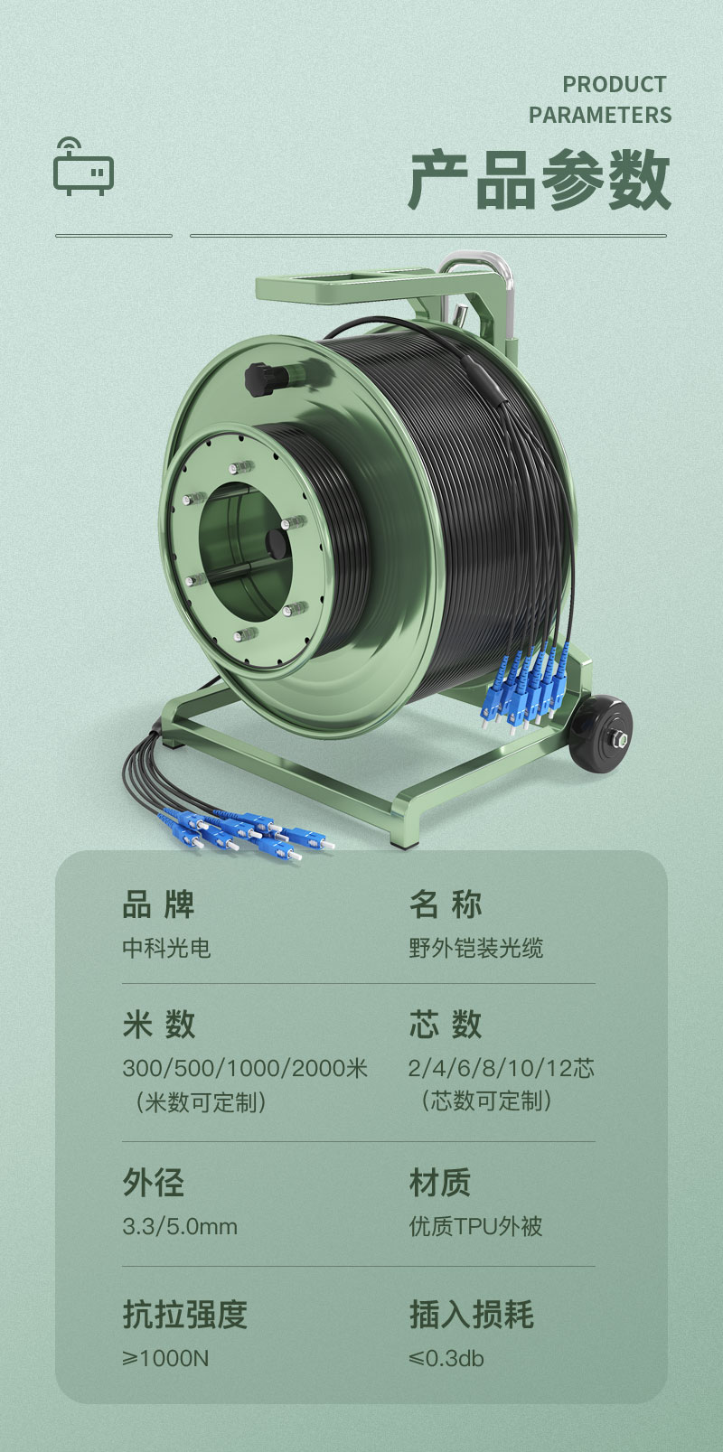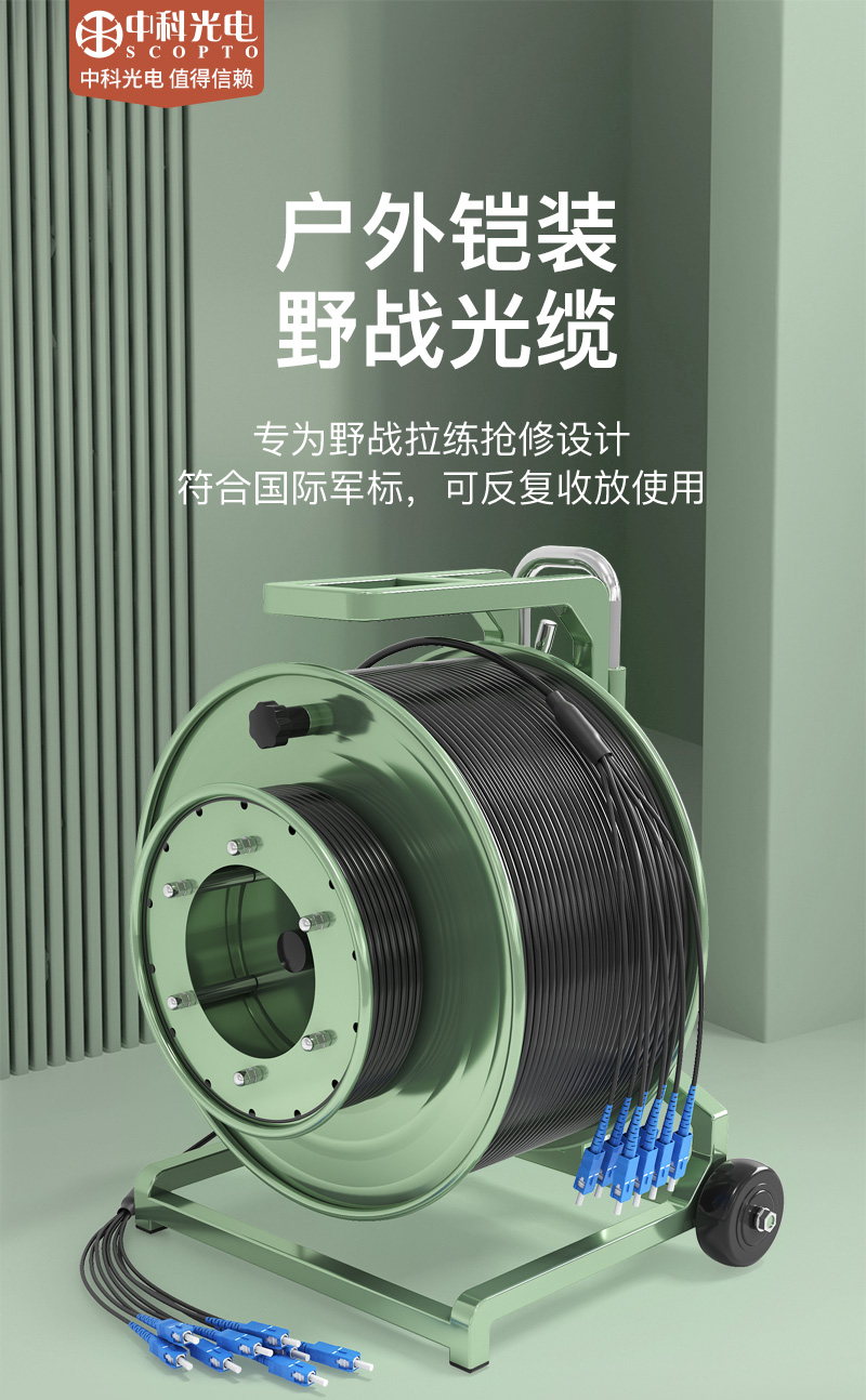 中科光電 單模八芯室外TPU野戰(zhàn)光纜 鎧裝防水基站通信野外拉練搶修  1000/2000米+放纜車(chē)+SC接口