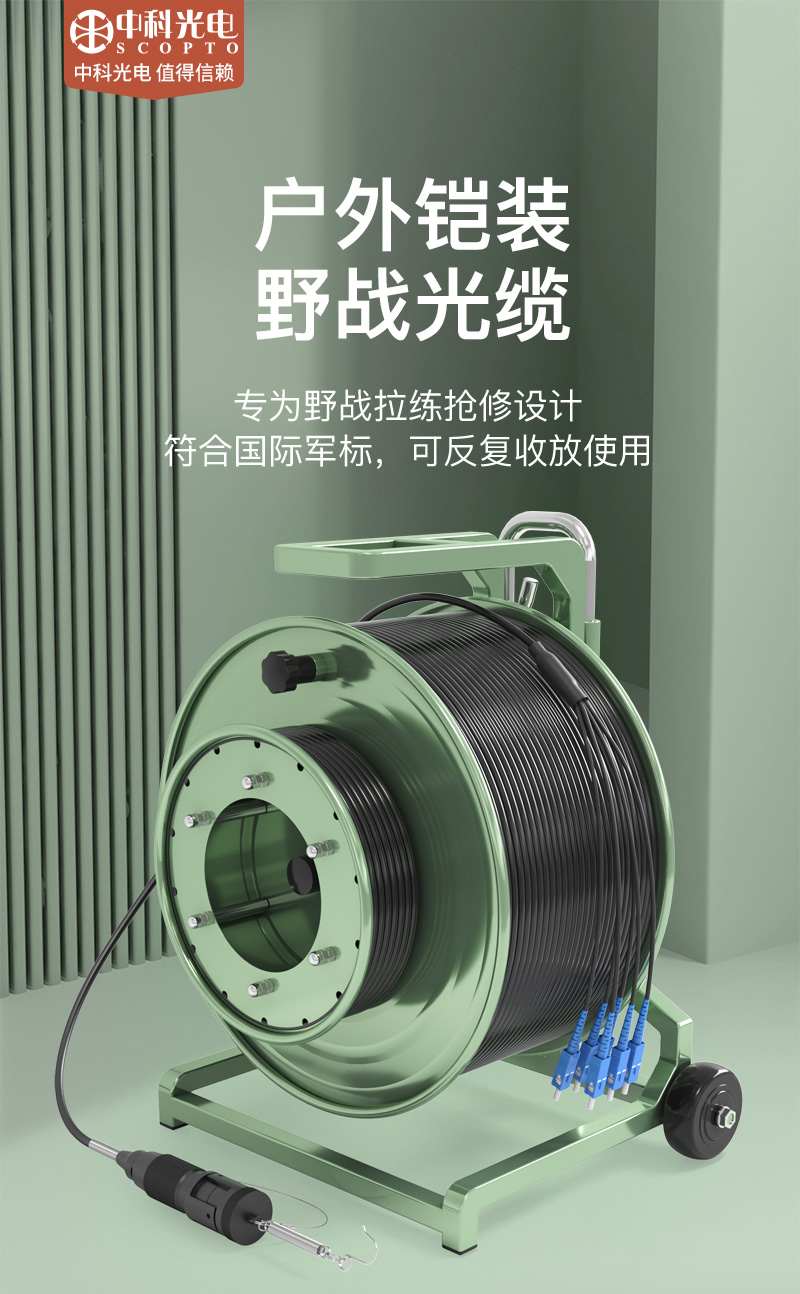 中科光電 單模八芯車壁式TPU室外野戰(zhàn)光纜鎧裝防水通信野外拉練搶修1000/2000米+放纜車+航空頭-SC頭