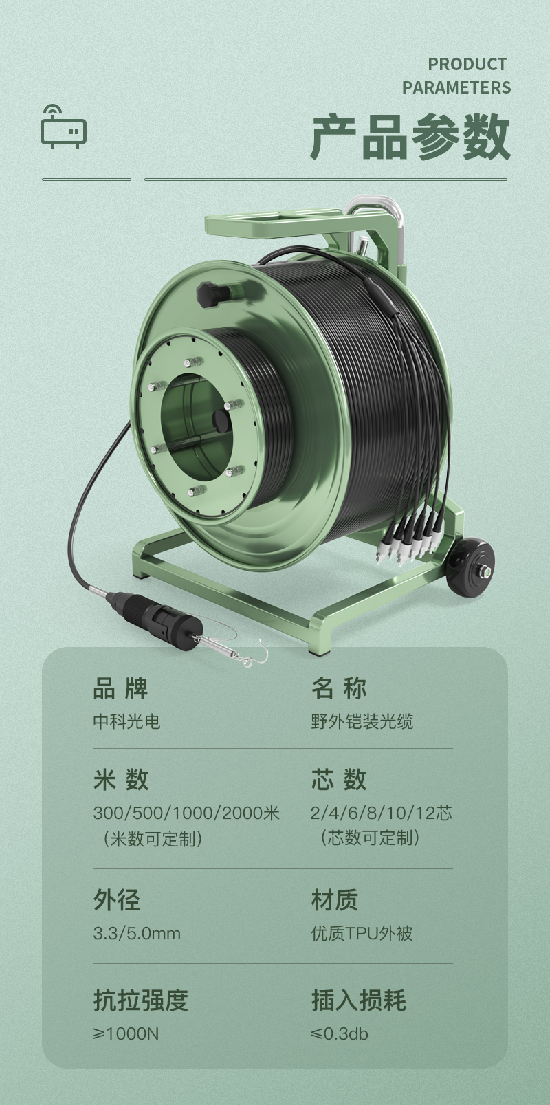 中科光電 單模八芯車(chē)壁式TPU室外野戰(zhàn)光纜鎧裝防水通信野外拉練搶修1000/2000米+放纜車(chē)+航空頭-FC頭