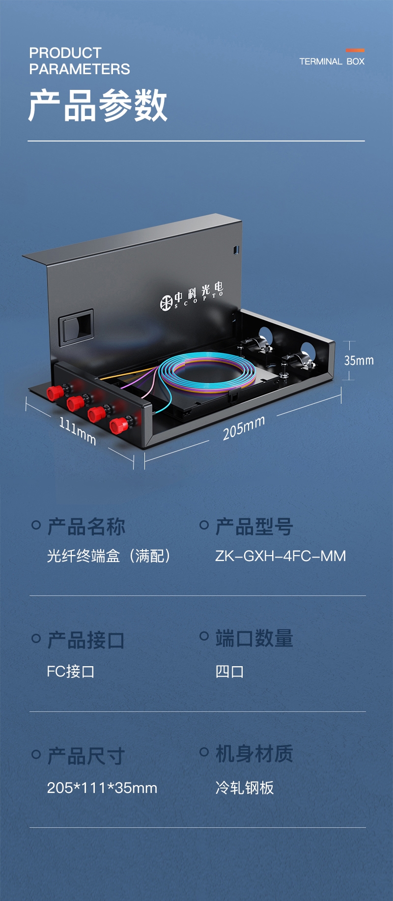 中科光電 光纖終端盒4口 4芯光纖熔接盒 光纜接續(xù)盒 接線熔纖盒 FC多模滿配尾纖法蘭 壁掛式 ZK-GXH-4FC-MM