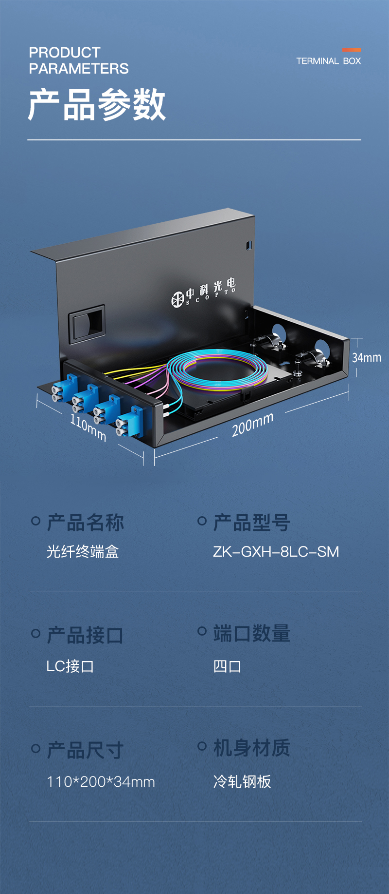 中科光電 光纖終端盒4口 8芯光纖熔接盒 光纜接續(xù)盒 接線熔纖盒 LC單模滿配尾纖法蘭 壁掛式 ZK-GXH-8LC-SM