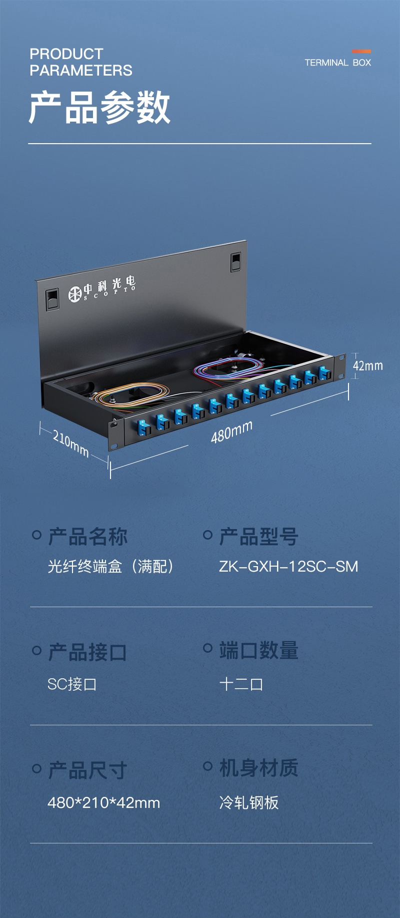 中科光電 光纖終端盒12口 12芯光纖配線架 光纜接續(xù)盒接線熔纖盒 SC單模滿配尾纖法蘭 機(jī)架式 ZK-GXH-12SC-SM