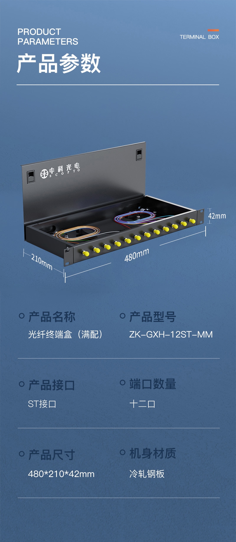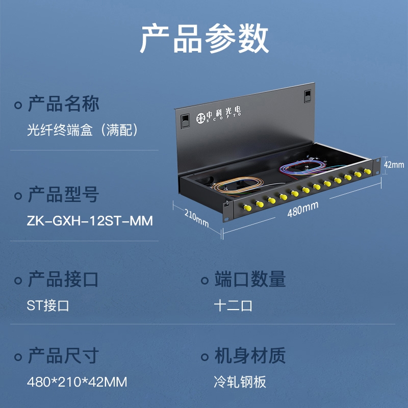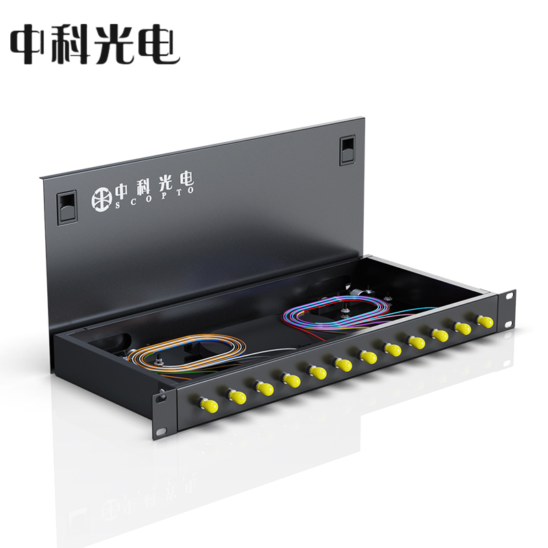 中科光電 光纖終端盒12口 12芯光纖配線架 光纜接續(xù)盒接線熔纖盒 ST多模滿配尾纖法蘭 機架式 ZK-GXH-12ST-SM