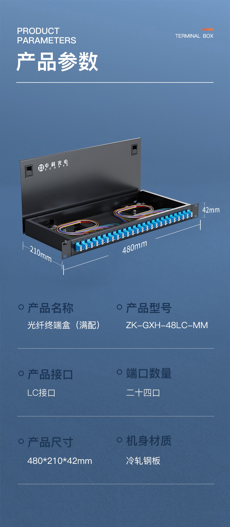 中科光電 光纖終端盒24口 48芯光纖配線架 光纜接續(xù)盒接線熔纖盒 LC多模滿配尾纖法蘭 機架式 ZK-GXH-48LC-MM