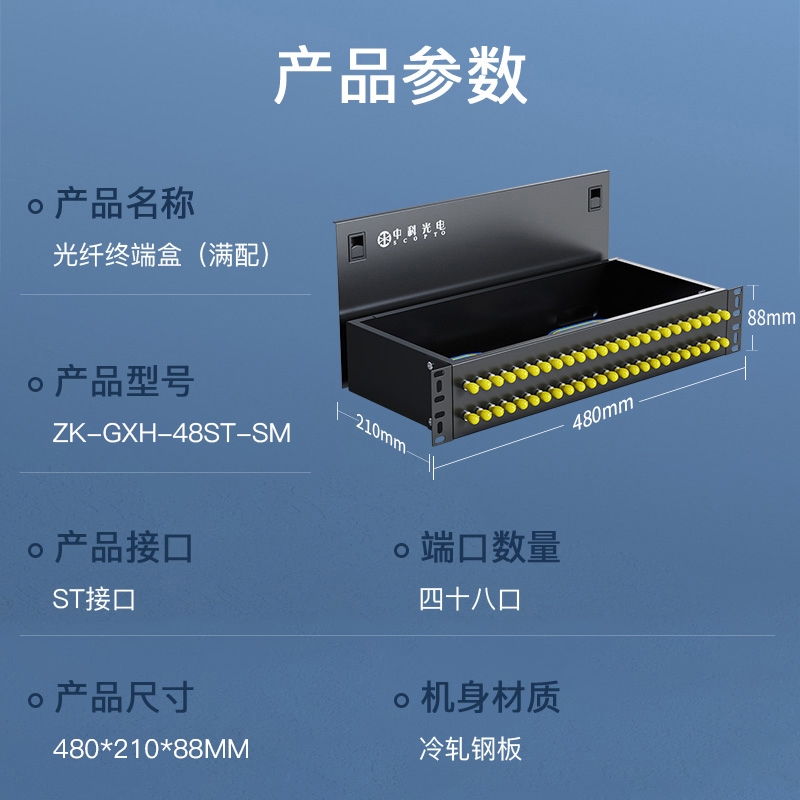 中科光電 光纖終端盒48口 48芯光纖配線架 光纜接續(xù)盒接線熔纖盒 ST單模滿配尾纖法蘭 機架式 ZK-GXH-48ST-SM