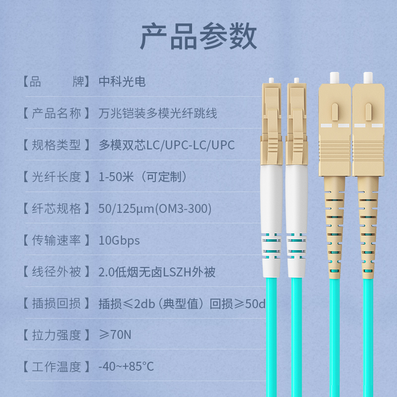 中科光電 OM3萬兆鎧裝光纖跳線LC-SC  多模雙芯尾纖 室內(nèi)抗拉壓防鼠咬光纖線  長度可定制