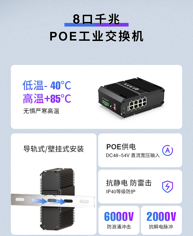 中科光電 工業(yè)交換機8口PoE交換機千兆 安防監(jiān)控工業(yè)級以太網(wǎng)絡(luò)攝像頭網(wǎng)線供電導(dǎo)軌壁掛式 ZK-7500-15-8GP