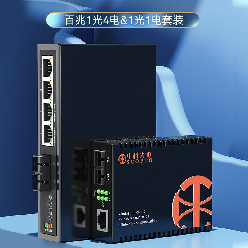 中科光電 百兆單模雙纖光纖收發(fā)器 光電轉(zhuǎn)換器 1光4電+1光1電 雙芯光纖轉(zhuǎn)網(wǎng)線ZK-FE/104-10KM ZK-FE-10KM一對