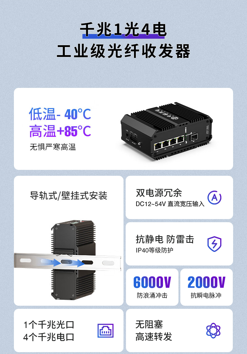 中科光電 工業(yè)級(jí)以太網(wǎng)光纖交換機(jī) 千兆1光4電口 光電轉(zhuǎn)換器12V導(dǎo)軌式1.25G光纖收發(fā)器