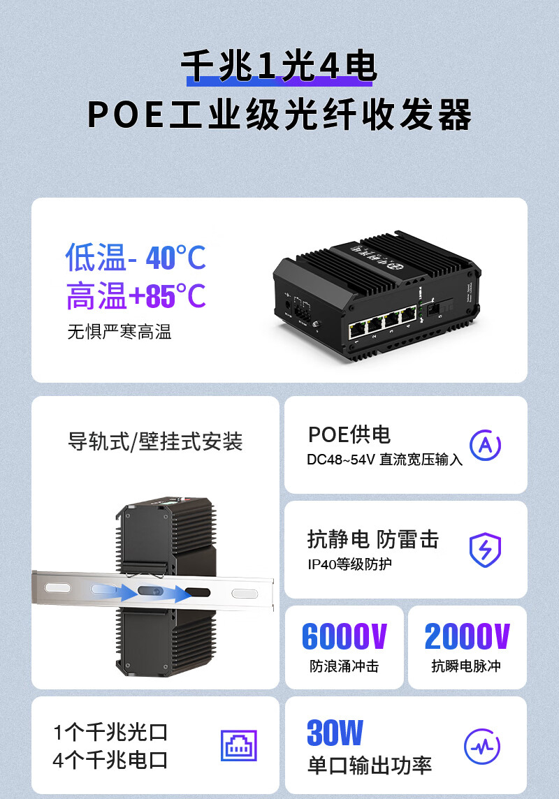 中科光電 POE工業(yè)級光纖收發(fā)器 千兆單模單纖1光4電轉(zhuǎn)換器以太網(wǎng)交換機48V導軌式 SC接口