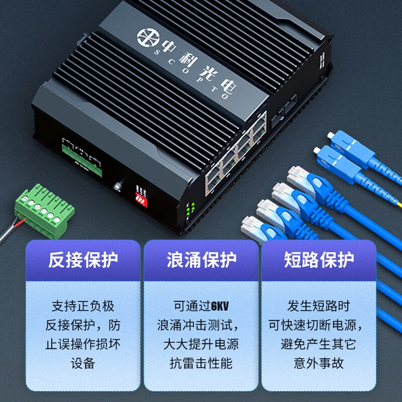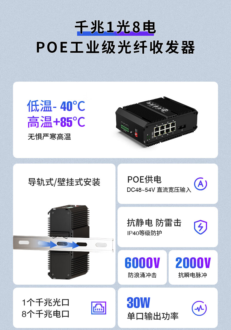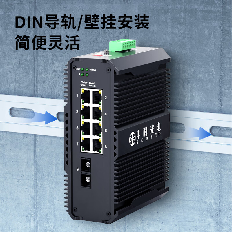 中科光電 POE工業(yè)級光纖收發(fā)器 千兆單模雙纖1光8電轉(zhuǎn)換器以太網(wǎng)交換機48V導軌式 SC接口