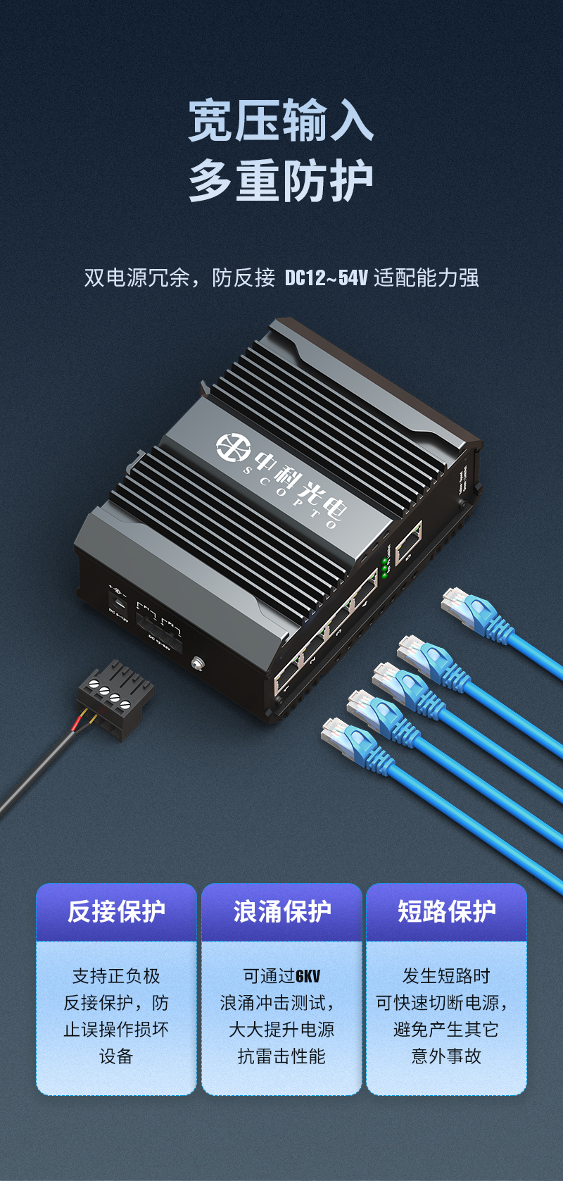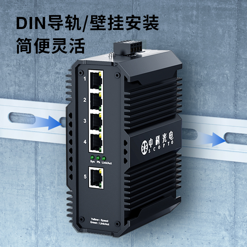 中科光電 工業(yè)級(jí)5口百兆交換機(jī) 安防監(jiān)控工業(yè)以太網(wǎng)交換機(jī) 12V/24V/48V供電導(dǎo)軌壁掛式安裝 ZK-7000-15-5FE