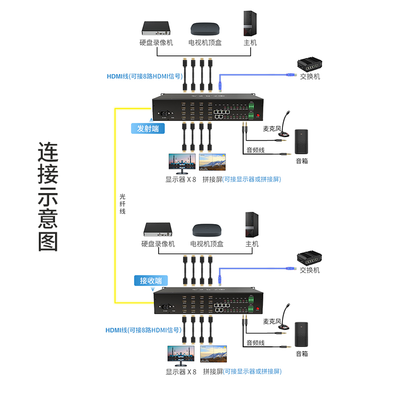 中科光電 HDMI視頻光端機(jī) 8路雙向HDMI+8路雙向音頻+1路數(shù)據(jù)+2路百兆網(wǎng)絡(luò)+4路電話 ZK-8VAS-1R2FE4P