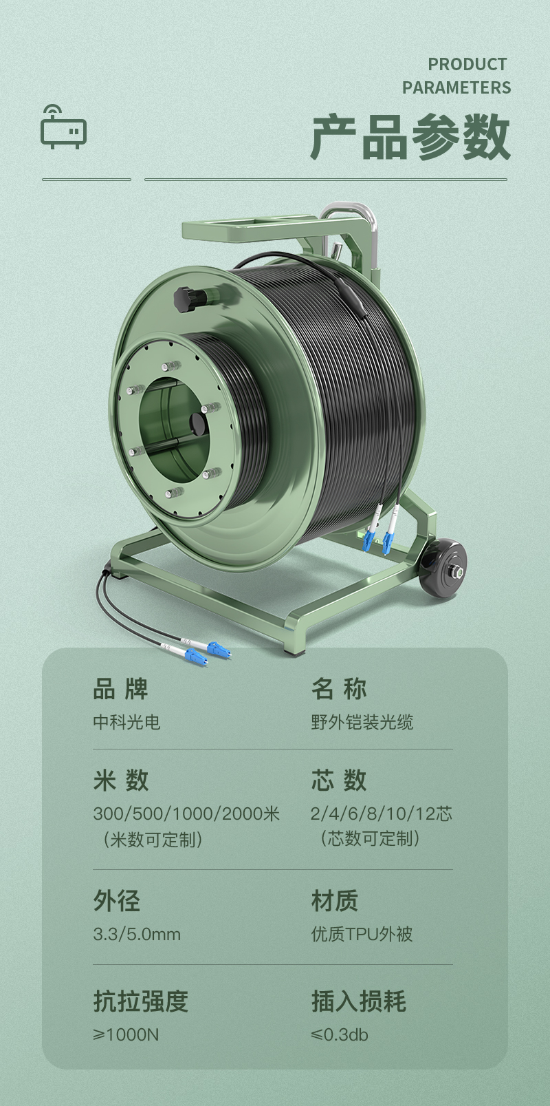 中科光電 單模雙芯室外TPU野戰(zhàn)光纜 鎧裝防水基站通信野外拉練搶修  1000/2000米+放纜車+LC接口